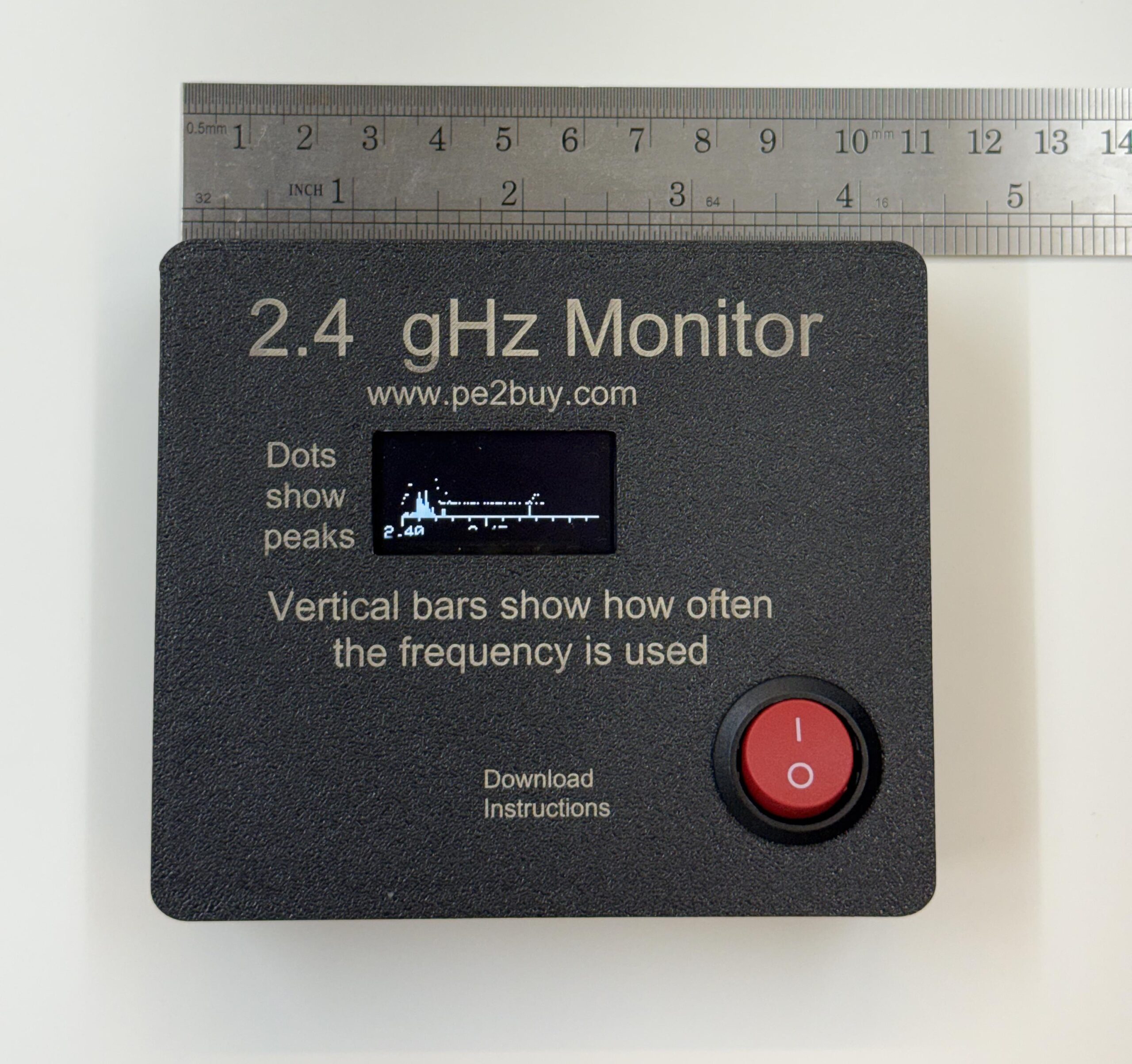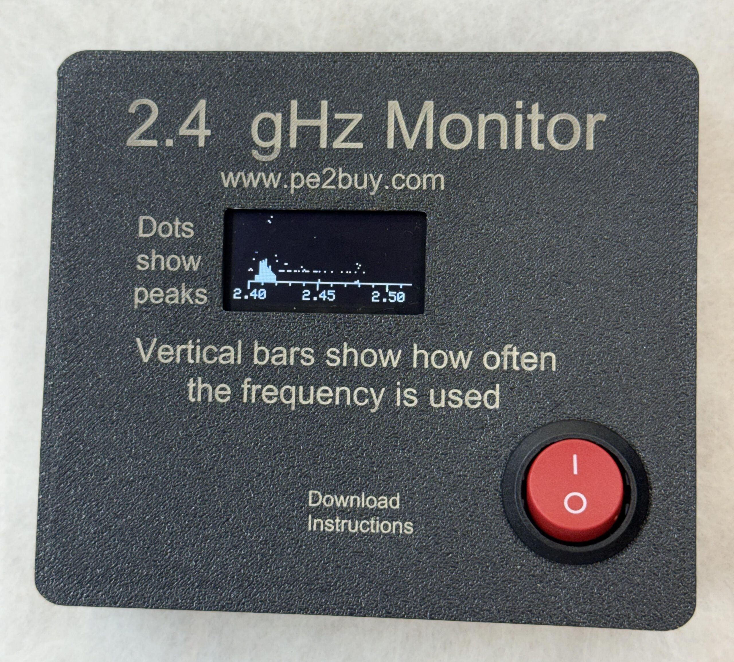 Our 2.4-GHz Scanner is a small 9v battery powered device that shows a simple view of what is happening in the 2.4 band. It scans the band and displays how often a signal is present at any frequency within the band. If there is a source of continuous signal within the band, it will display that all the way to the top of the screen.