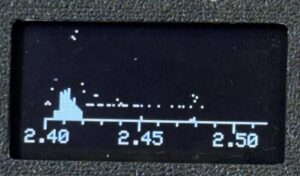 Technically the 2.4-GHz Scanner scans frequencies from 2.4 to 2.517 GHz which includes the RC 2.4-GHz band, commonly called the Industrial, Scientific, and Medical (ISM) band from 2.4 to 2.5 GHz. The scanner measures whether a signal is present at each 1-MHz bandwidth over this frequency range, displaying 118 channels or frequency bands. The scanner does not measure the received signal strength or RSSI (Received Signal Strength Indicator) but instead indicates the presence of signal with the amplitude displayed being a “frequency of occurrence” of signal. The taller the line on the display the more frequent that signal is present.