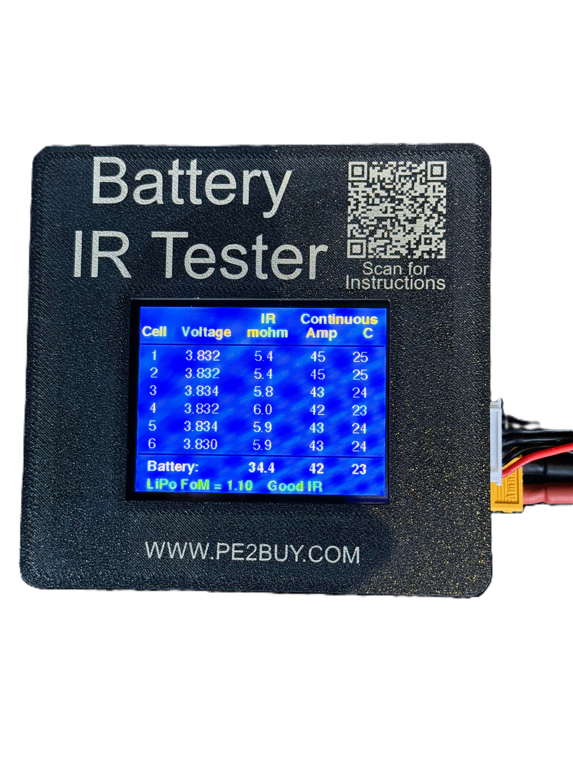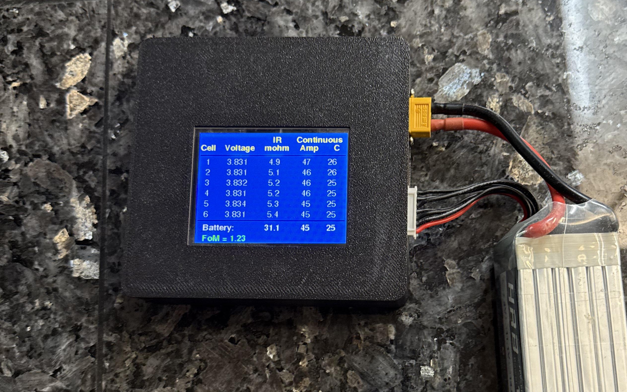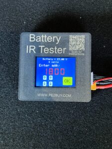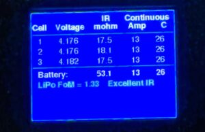 Our battery tester is a hand held unit powered by the battery under test. It works for 2-6 cell LiPo batteries and gives individual cell voltage, cell resistance (IR), max safe cell output (amps), and the “C” rating. Plus it calculates the total pack safe max Amps and C rating. At the bottom of the screen is a Figure of Merit calculated based on your battery and it estimates how good your battery is.